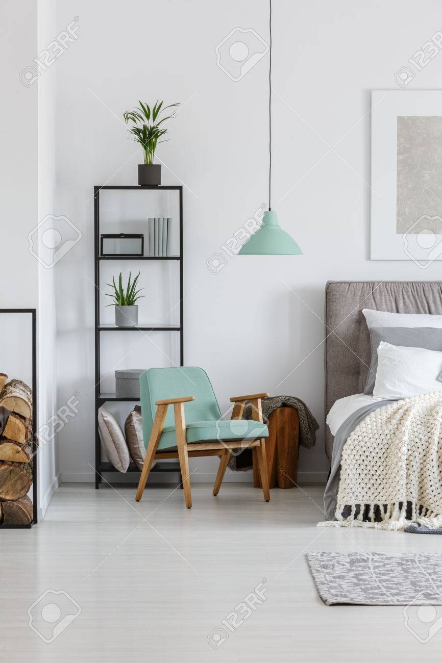Small Mint Lampshade Hanging Above Comfy Wooden Chair In Bedroom Stock Photo Picture And Royalty Free Image Image 83457416