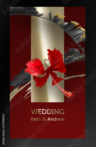 Tropical Black Gold Leaves On Maroon Background Vector Beautiful Botanical Design With Tropic Jungle Leaves Exotic Red Flower Hibiscus And Golden Paint Smear Wedding Invitation Card Holiday Sale Buy This Stock